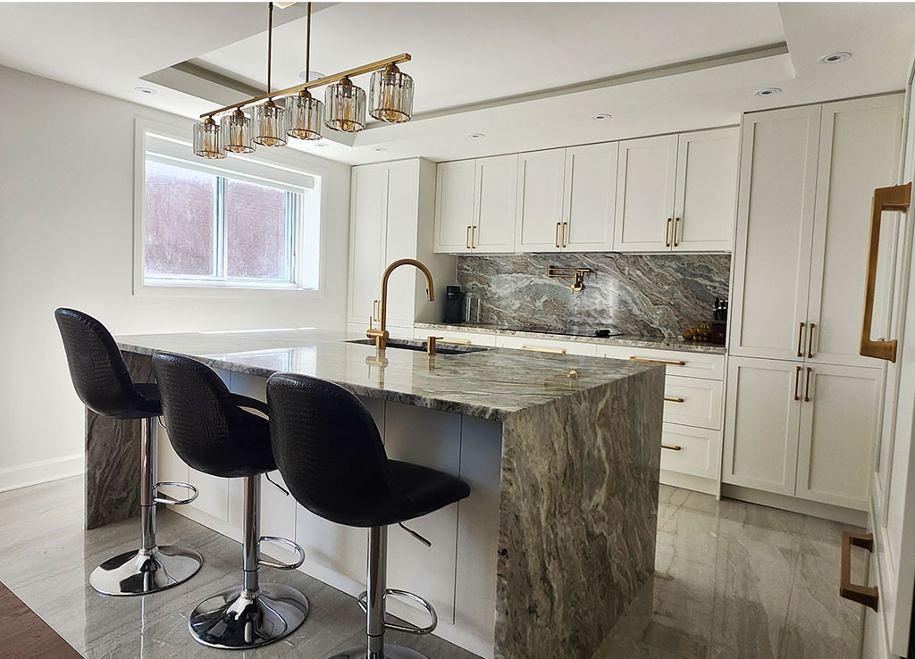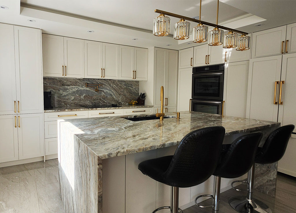 Un espace sobre et élégant où le marbre, mis en valeur sur l’îlot central et la crédence, devient la pièce maîtresse. Les armoires blanches avec poignées dorées structurent la cuisine tout en renforçant l’élégance du lieu. L’îlot, pensé comme un espace de convivialité, intègre également des fonctions pratiques pour le quotidien. L’éclairage suspendu vient sublimer l’ensemble en apportant une touche contemporaine.