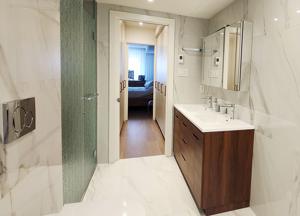 La salle de bain reprend l’effet marbre sur les murs et le sol pour créer une ambiance luxueuse et lumineuse. Le mobilier bois ajoute une chaleur naturelle qui équilibre l’ensemble. Les lignes épurées du mobilier, la robinetterie chromée et la douche vitrée apportent modernité et sobriété. L’espace a été conçu pour conjuguer bien-être et fonctionnalité.